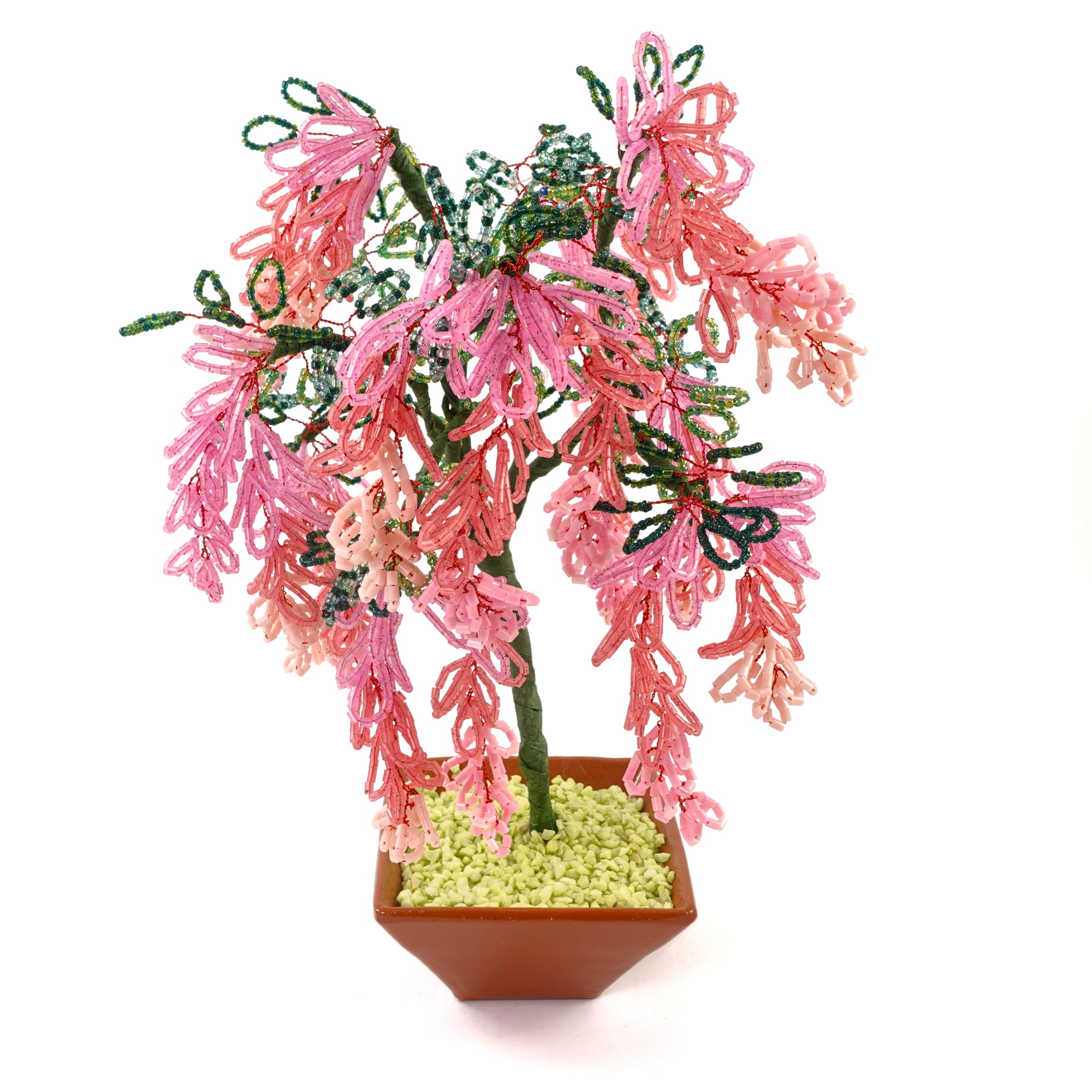 Conjunto de glicinas en ramas, hechas en abalorio, artesanalmente, introducidas en maceta cuadrada, con una altura de 40 cms, con un peso de 1 kilo, elaborado en Granada, España, joya artesanal.