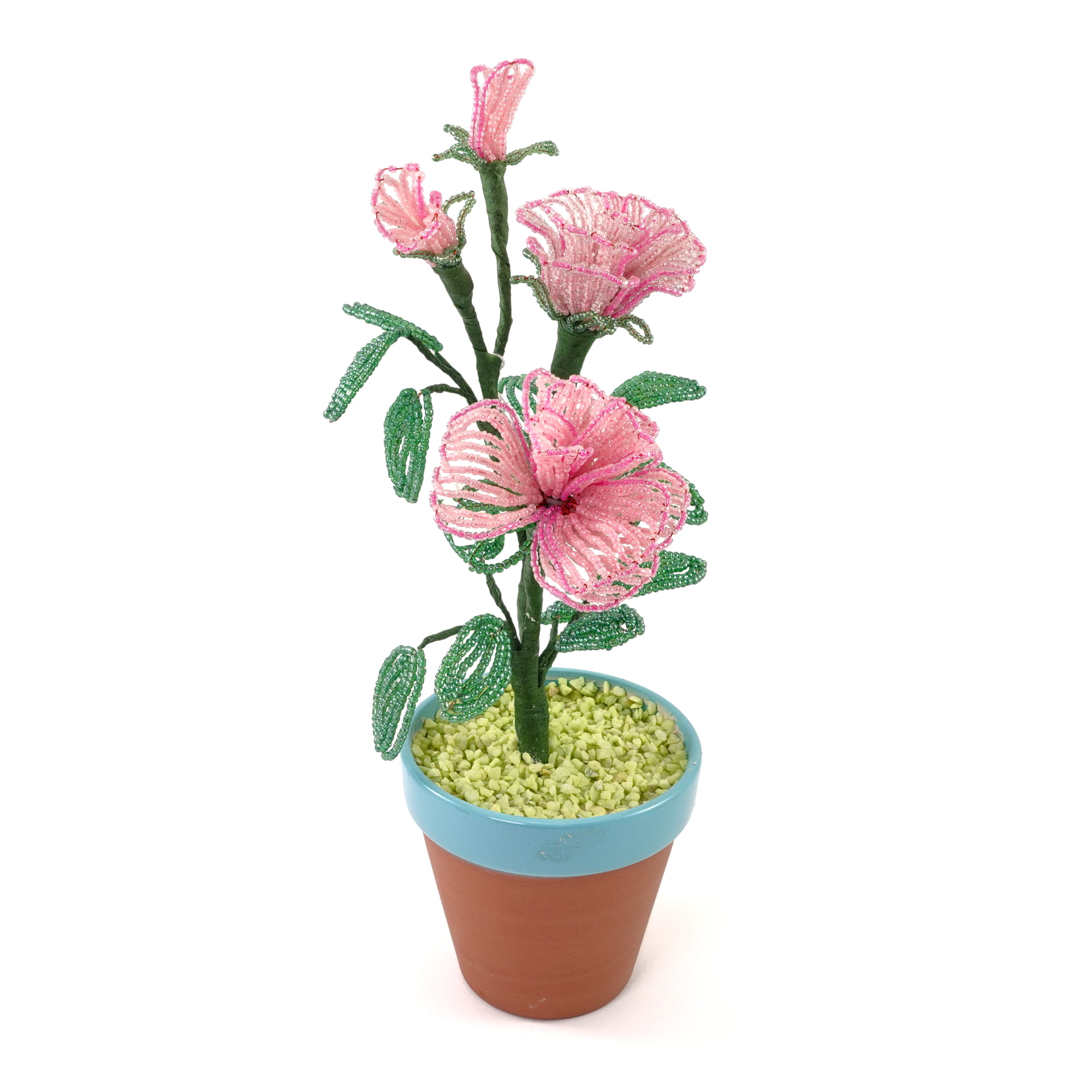 Conjunto de rosas, hechas en abalorio, artesanalmente, introducidas en una maceta de color marron con su aro color celeste, artesania moderna, elaborada con alambre de cobre de alta calidad, realizado en Granada, España con una altura de 25 cms, terminada.