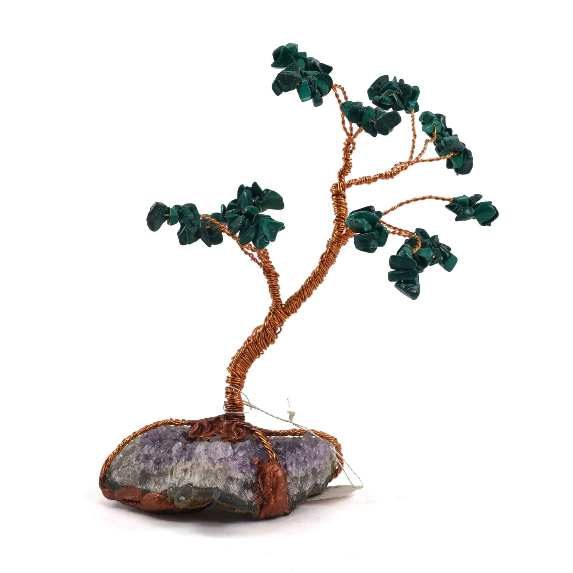 Arbol elaborado en piedras, mineral malaquita, trabajado con alambre de cobre de excelente calidad de 15 cms de alto por 10 cms de ancho, con un peso de 1 kilo, engarzando sus raices en una geoda de cuarzo amatista.