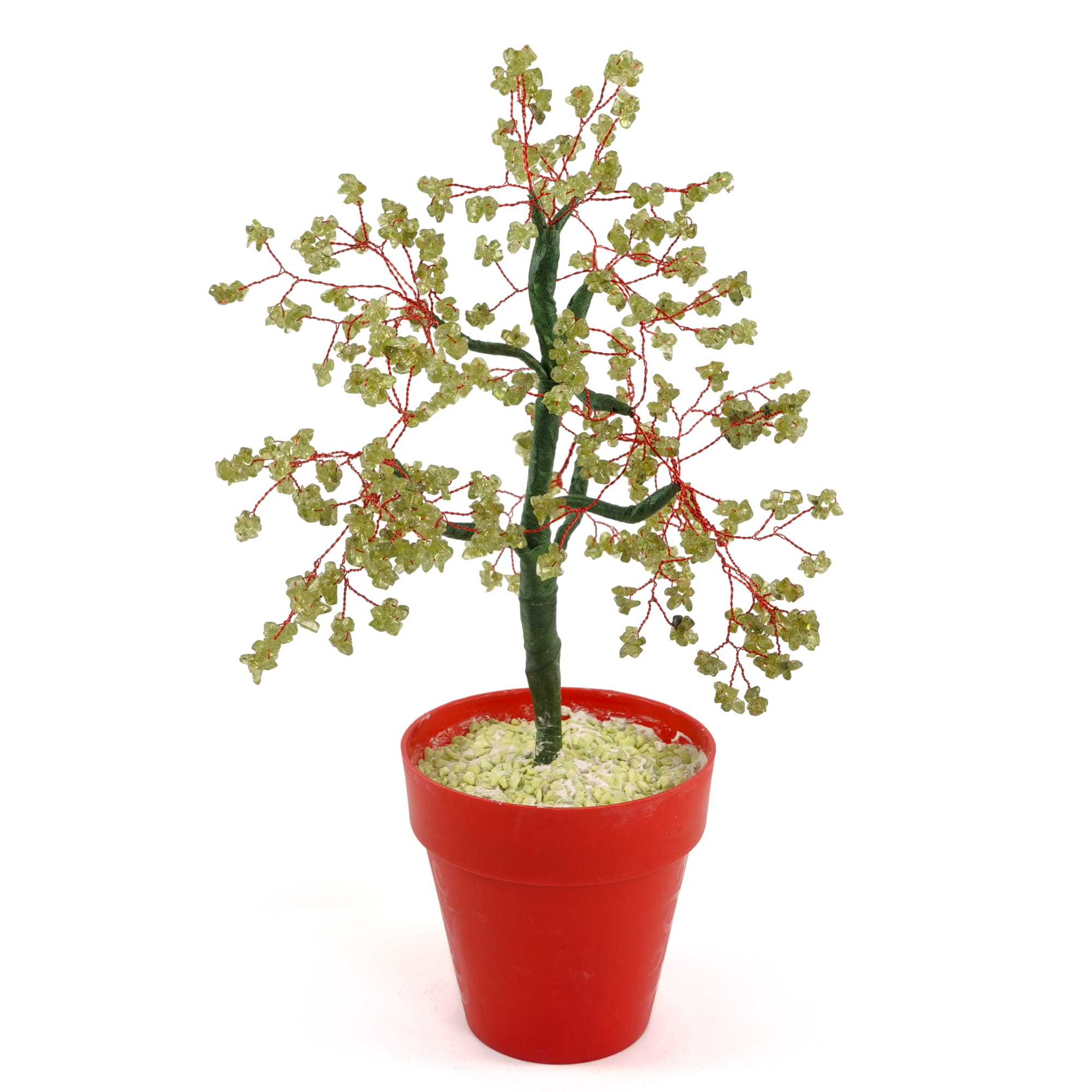 «Arbol en piedra, mineral olivino trabajado artesanalmente con alambre de cobre y colocado en maceta de plástico rojo, con una altura de 30 cms, y con peso de 1 kilo terminado.
