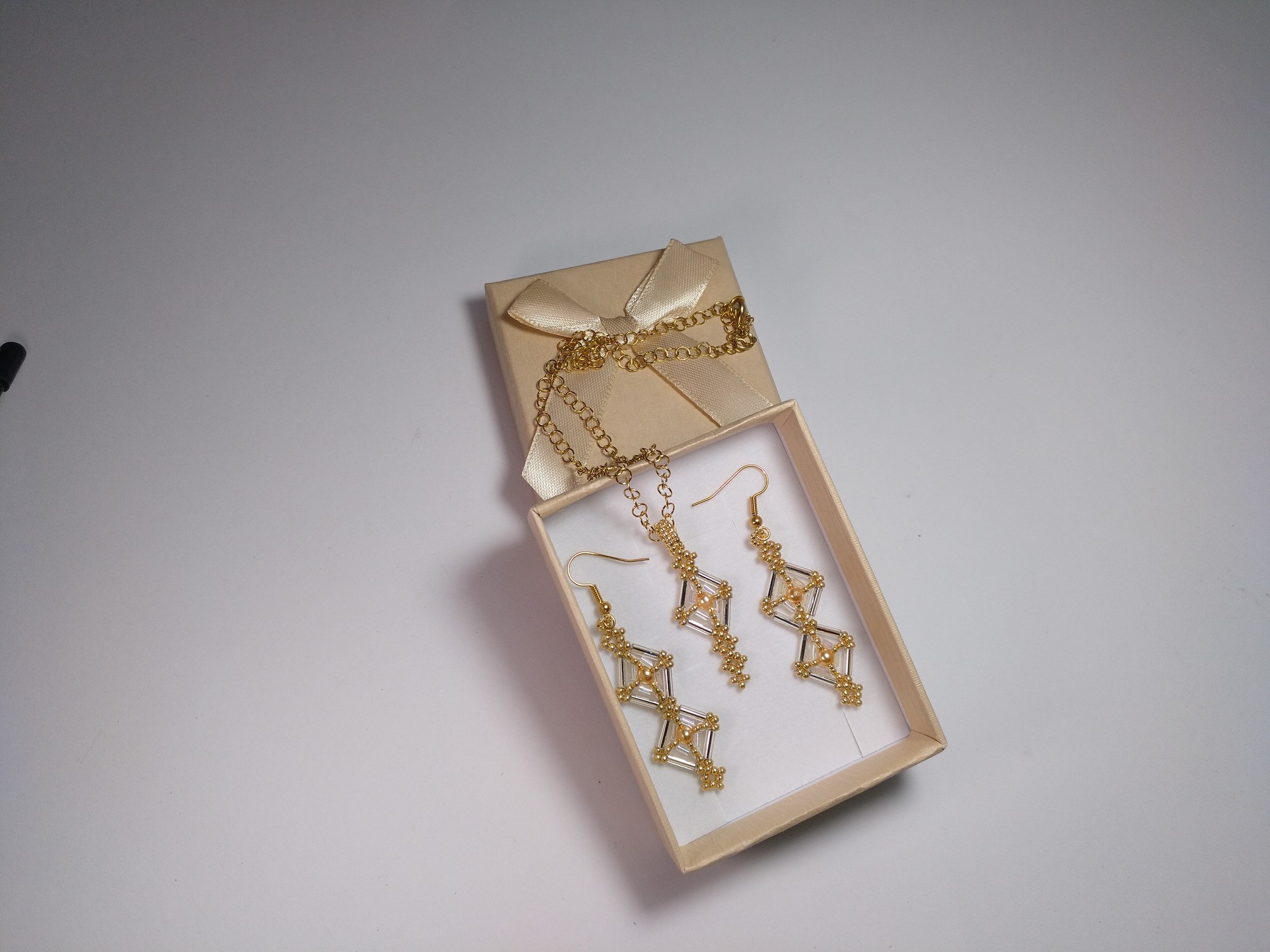 Pendant with earrings, pendant measures 5 cm, and earrings measure 5 cm, with a 40 cm gold chain, seed beads, Czech Republic pearls in Nachees Peach, with beads of two sizes. Delivered in a jewelry box with a lid for presentation. Handmade, UNIQUE AND ORIGINAL DESIGN.