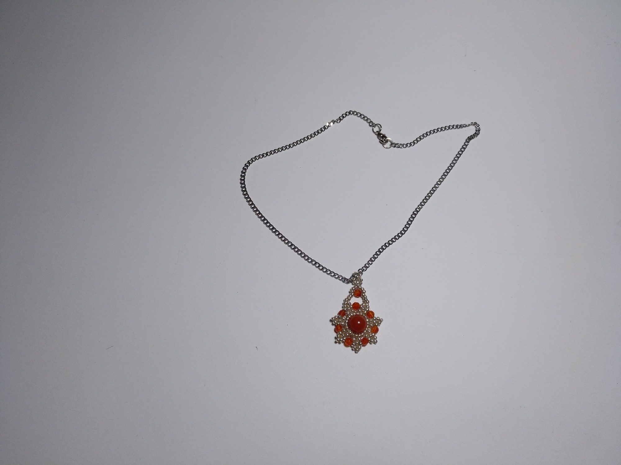 Flamante colgante en mineral agata corneola, NO PINTADA, NO TEÑIDA, la cual esta hecho a mano, con una esfera de agata corneola central, y esferas laterales, pero con agata corneola facetada, con rocalias, con cadena de acero con un largo de 40 cms. Acompañada de su cadena correspondientes, y entregada en caja de carton con tapa, tipo de joyeria.