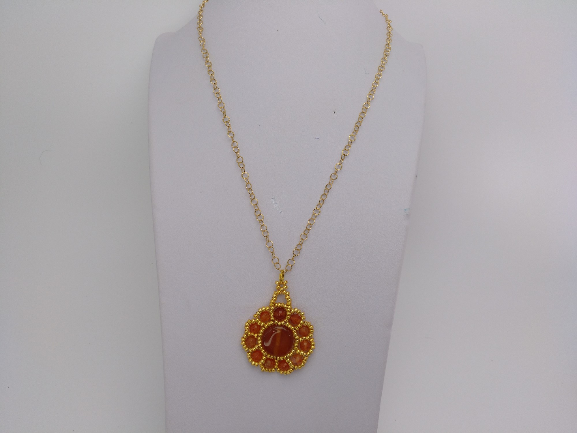 Colgante en Agata Corneola, con un largo de cadena de 50 cms, y el colgante de 3×3 cms, hecho con cabujon redondo de Agata Corneola, haciendo esfera en Agata Corneola lisa, y esferas de Agata Corneola facetadas, con cierre mosqueton dorado al igual que su cadena, con rocallas, verdadera joya artesanal, hecha por su artesana y vista en el canal de youtube de collares y pendientes mz, donde se observa el manipuleo de sus materiales al igual que sus herramientas. DISEÑO UNIO Y ORIGINAL EN SU MATERIA, confeccionado en Granada, España, apto para todo publico. No olvidemos que el mineral AGATA, atrae el dinero, y actua sobre el metabolismo humano.