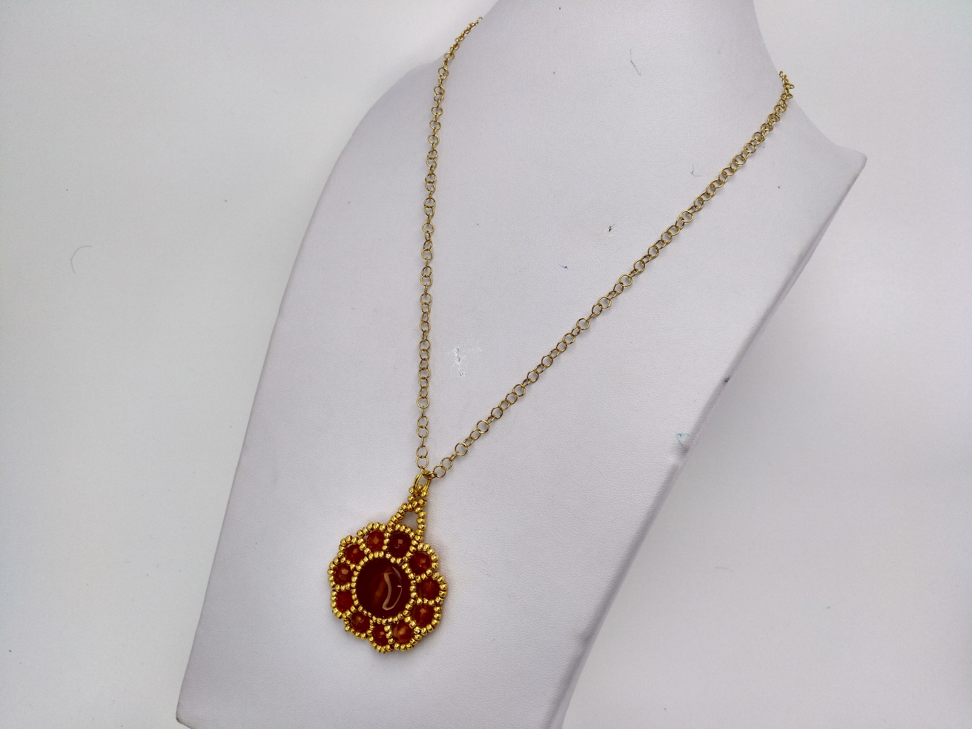 Corneola Agate pendant, with a 50 cm chain length, and the 3×3 cm pendant, made with a round Corneola Agate cabochon, forming a smooth Corneola Agate sphere, and faceted Corneola Agate spheres, with a gold-plated lobster clasp like its chain, with seed beads. A truly handcrafted jewel, made by its artisan and seen on the mz necklaces and earrings YouTube channel, where you can see the handling of her materials as well as her tools. UNIQUE AND ORIGINAL DESIGN, made in Granada, Spain, suitable for all audiences. Let’s not forget that the mineral agate attracts money and affects human metabolism.