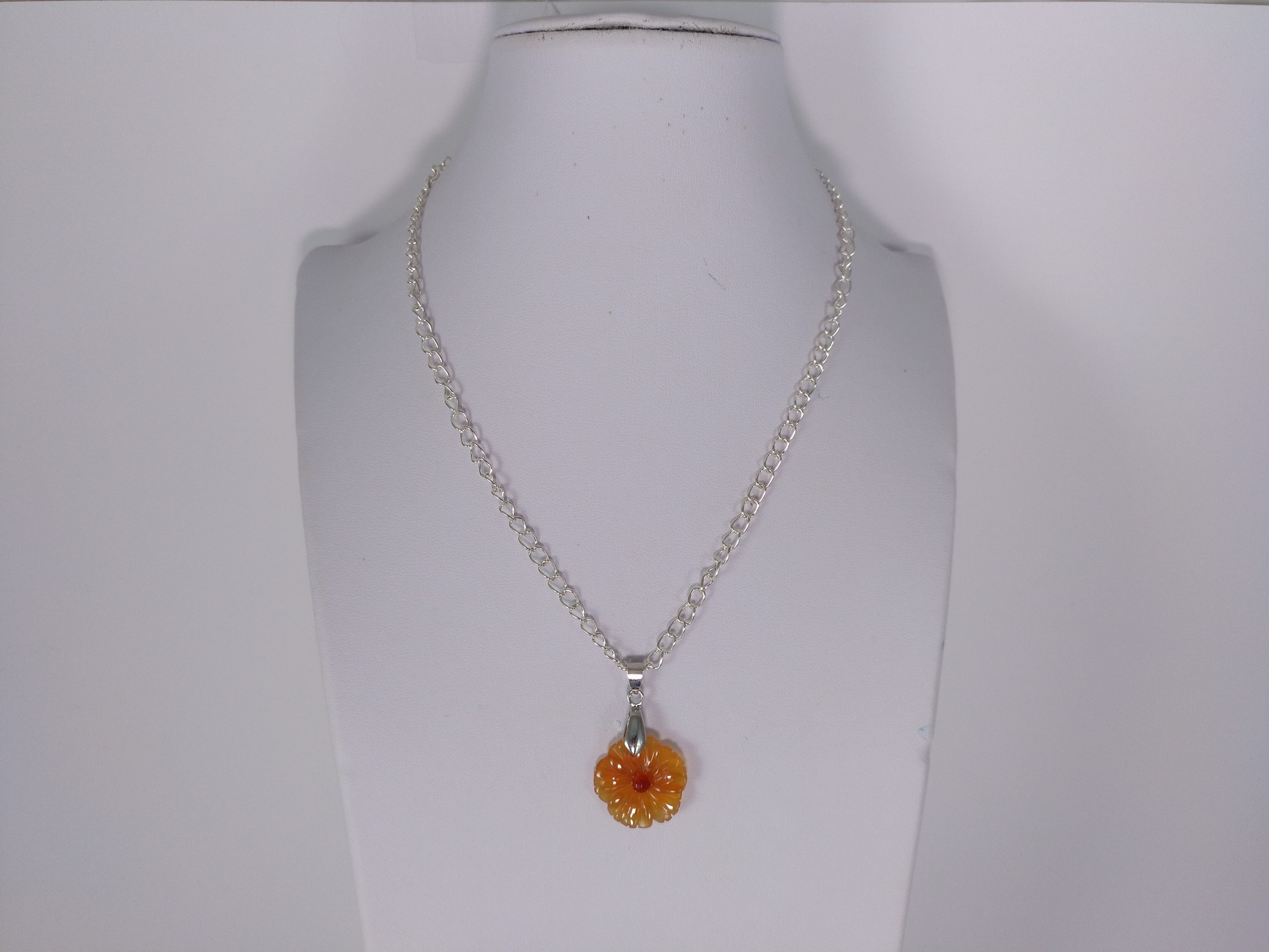 Bellesimo colgante con flor de agata corneola, con un largo de 45 cms, su colgante es netamente de mineral agata corneola, con cadena de acero inoxidable y con cierre mosqueton plateado, hecho a mano por su artesana,que aplica su ingenio en los trabajos que realiza, UNICO DISEÑO ORIGINAL. Hecho en Granada, España.-
