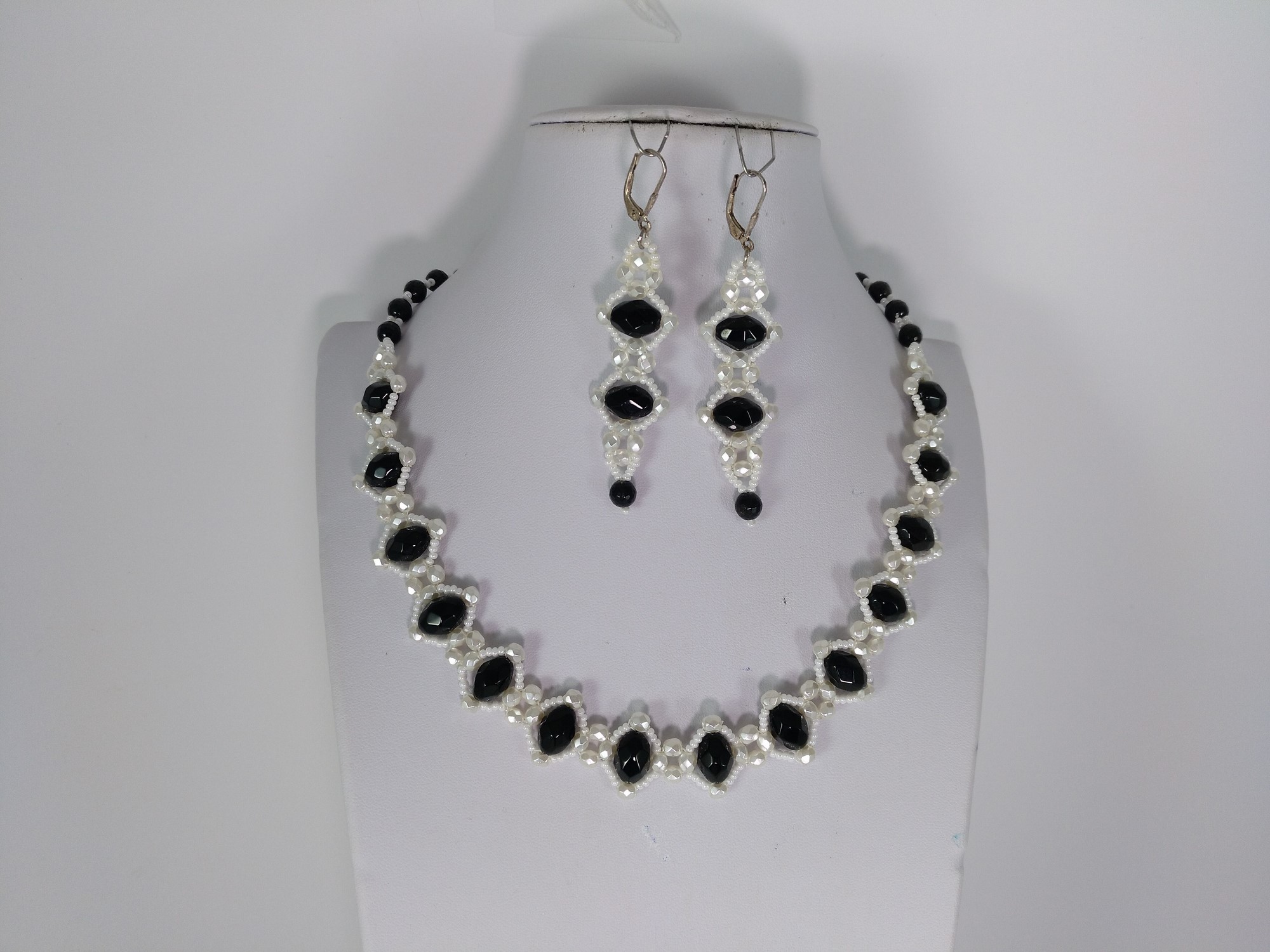 Flamante collar elaborado artesanalmente con olivas facetadas en onix negro, con turmalinas facetadas, facetadas de Bohemia, rocallas, cierr mosqueton plateado, hecho con mineral onix negro facetado, y sus correspondientes pendientes en plata, haciendo juego con el collar, medida del collar 45 cms y sus pendientes 7 cms, se entrega en caja de joyeria de color negro con tapa, material, cuero, UNICO DISEÑO ORIGINAL, producido en la provincia de Granada, España.