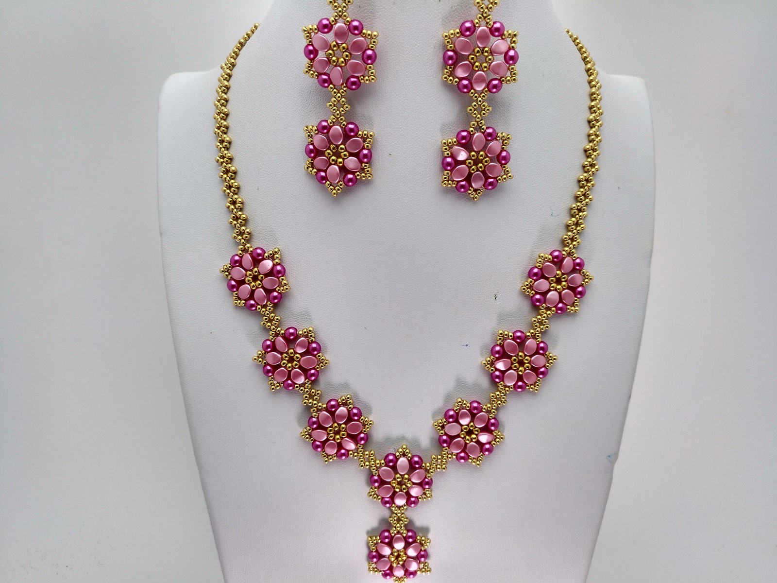 Excelente collar con pendientes en perlas y Pinch Beads, hecho a mano, largo del collar 45 cms, con una extensión total de 55 cms, terminado, sus pendientes en 6 cms. Joya que aporta luz y belleza para ti.