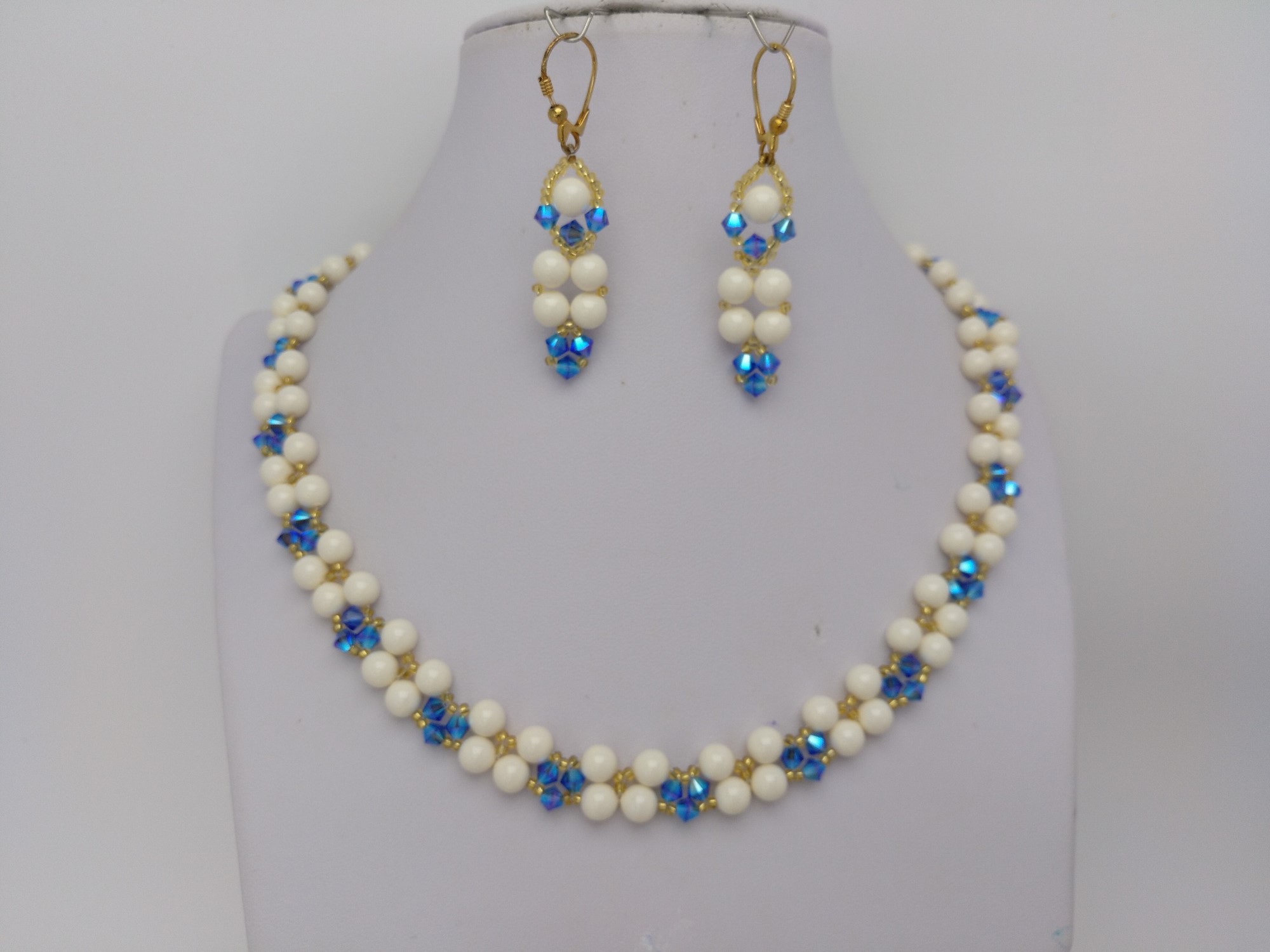 Collar de mujer con pendientes en Swarovski, hecho a mano, en forma artesanal, con un largo de 45 cms su collar, y los pendientes en 6 cms, elaborados con Perlas perladas de Swarovski, Tupies, rocallas, y terminado con cierre magnetico. Sus pendientes en plata dorada, entregandose para su envio en caja de carton de joyeria, en color negro con tapa, aterciopelado, UNICO DISEÑO Y ORIGINAL, visto en el canal de Youtube de collares y pendientesmz», el canal de las juyas artesanales para la mujer moderna, o en la pagina web: www.mineralesenventa.com, donde encontraran, otros modelos y para todos los gustos.