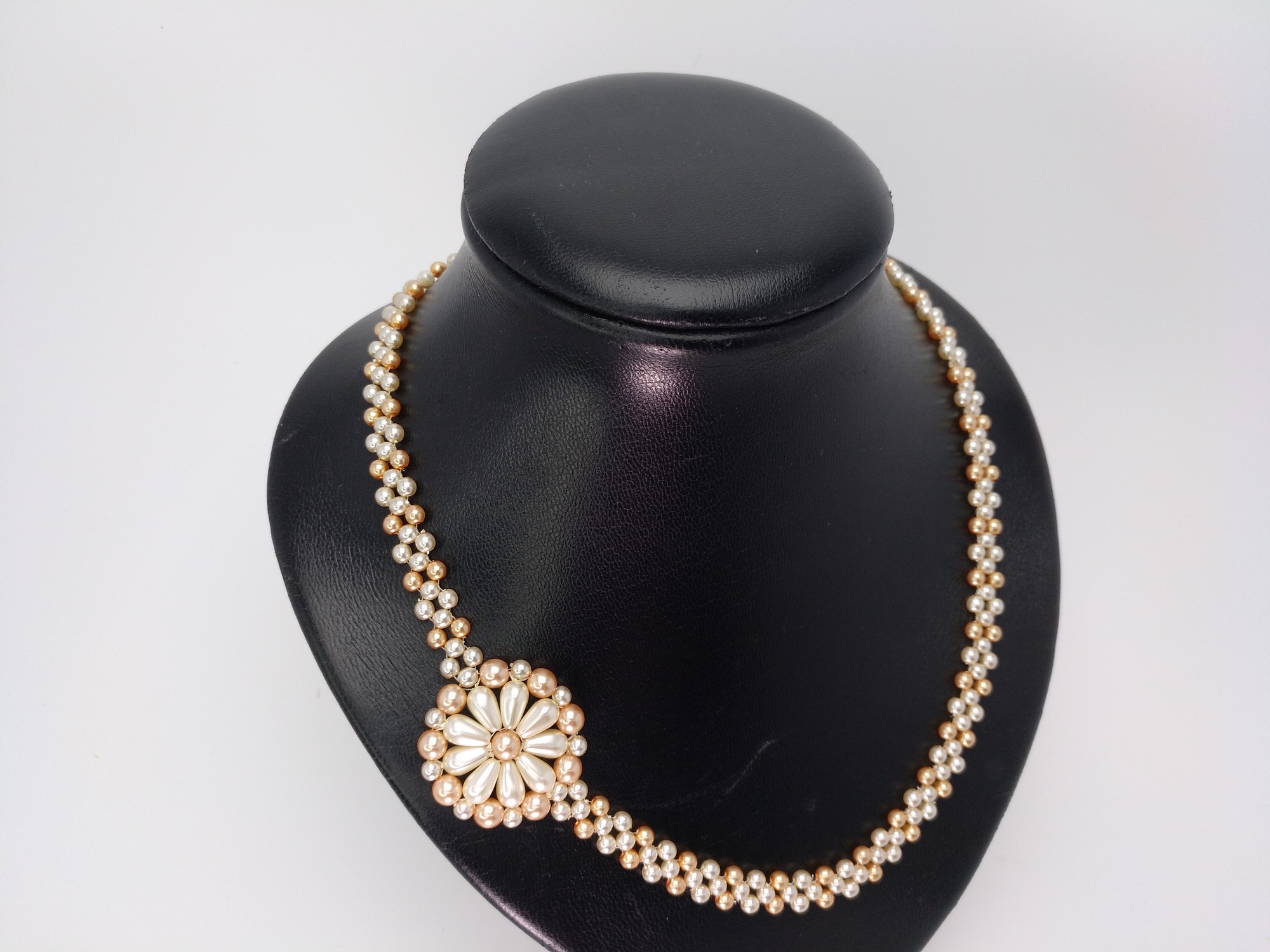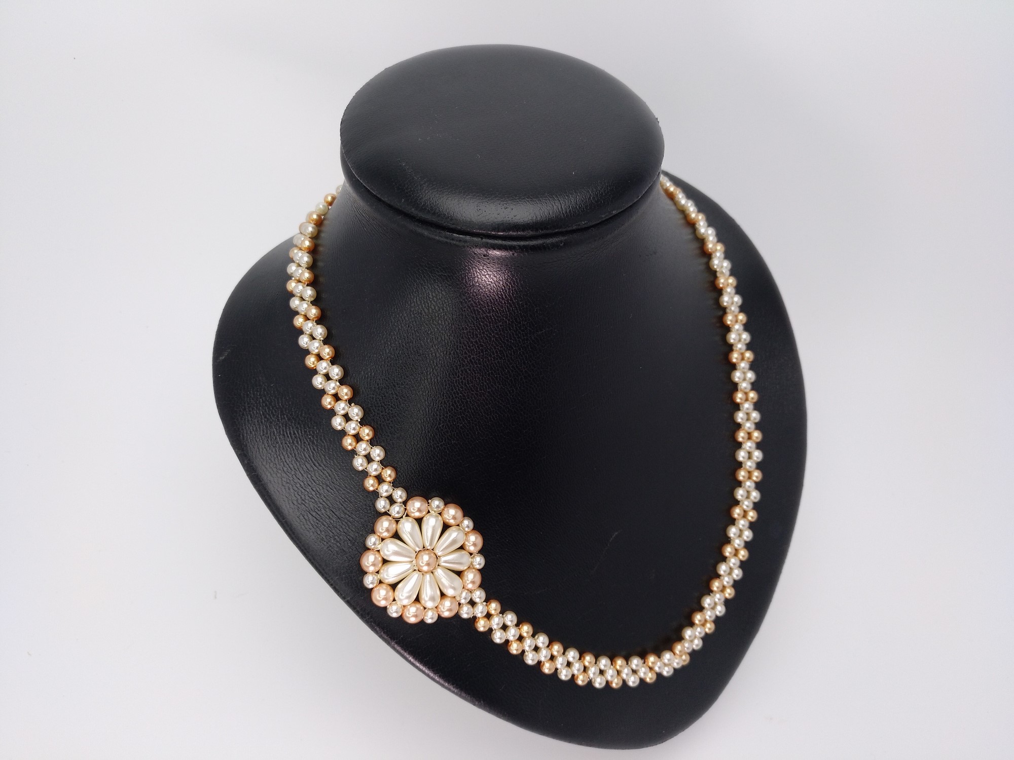 Commonly called the «LA MATINE» necklace, or a long necklace, made with pearls and drops, 50 cm long, handcrafted with peach-colored pearls in two sizes and white-colored pearls. On one side, it features a flower in the same shade as the necklace, finished with a silver-plated magnetic clasp. It comes with a cardboard jewelry box and its corresponding lid. Pearls represent women in all their femininity, giving love to their partners, a symbol most welcomed by those born in the month of JUNE, and within the zodiac sign, it corresponds to CANCER. PURELY HANDCRAFTED JEWELRY, UNIQUE AND ORIGINAL DESIGN, to be worn at any event or occasion, not to be ruled out as a corporate gift.