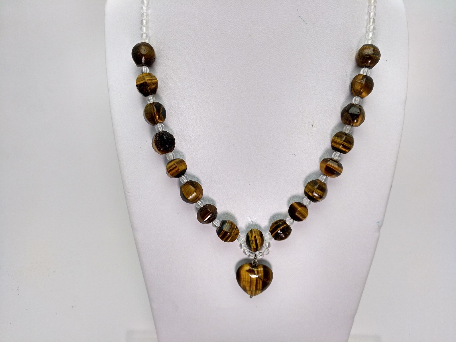 Con esferas y lentejas facetadas, en ojo de tigre, posee ademas esferas en mineral cuarzo hialino, transparente, y un flamante corazon en ojo de tigre como colgante, con cierre mosqueton plateado, acompañado con sus pendientes en plata, hechos con el mismo material.