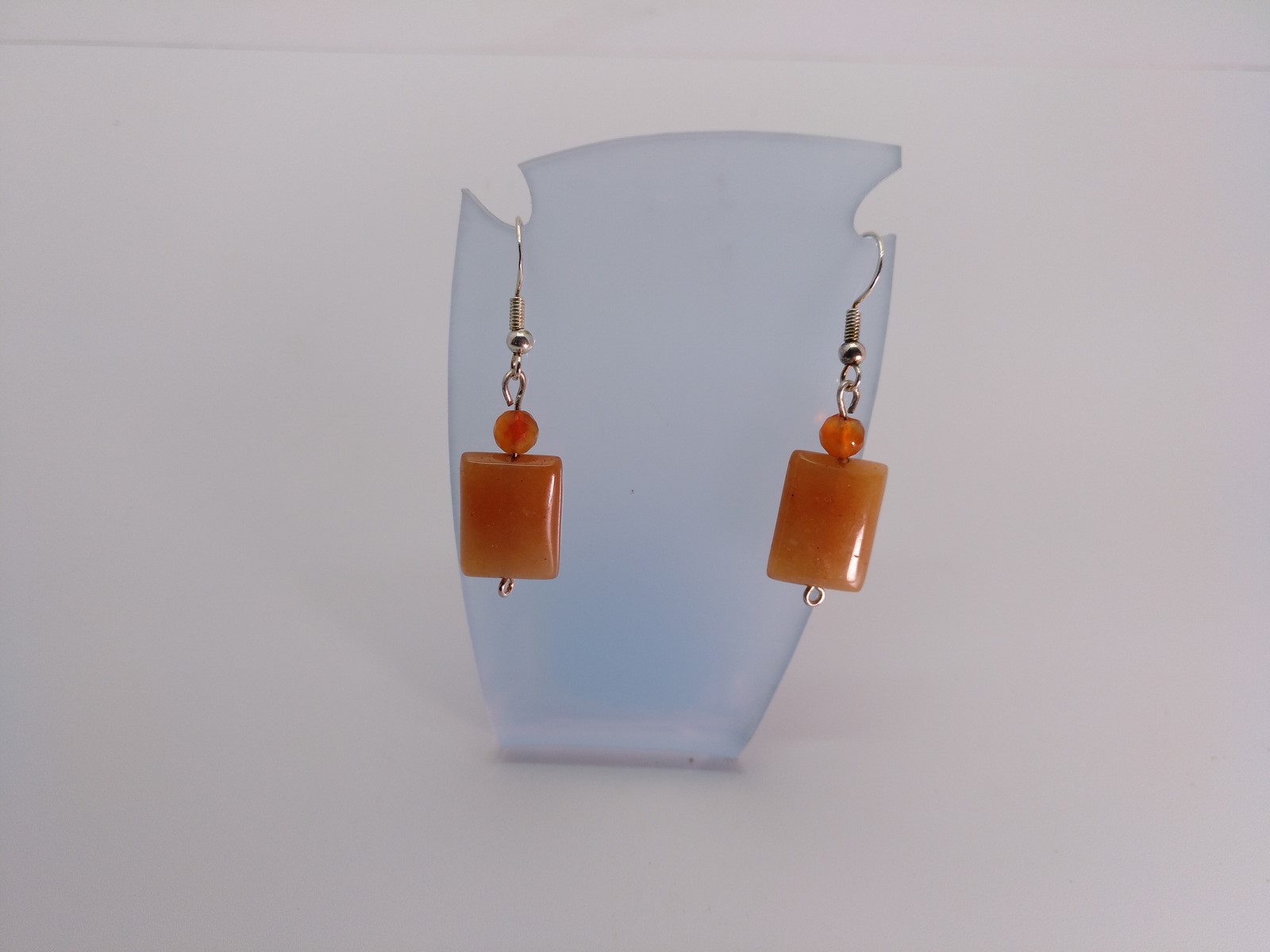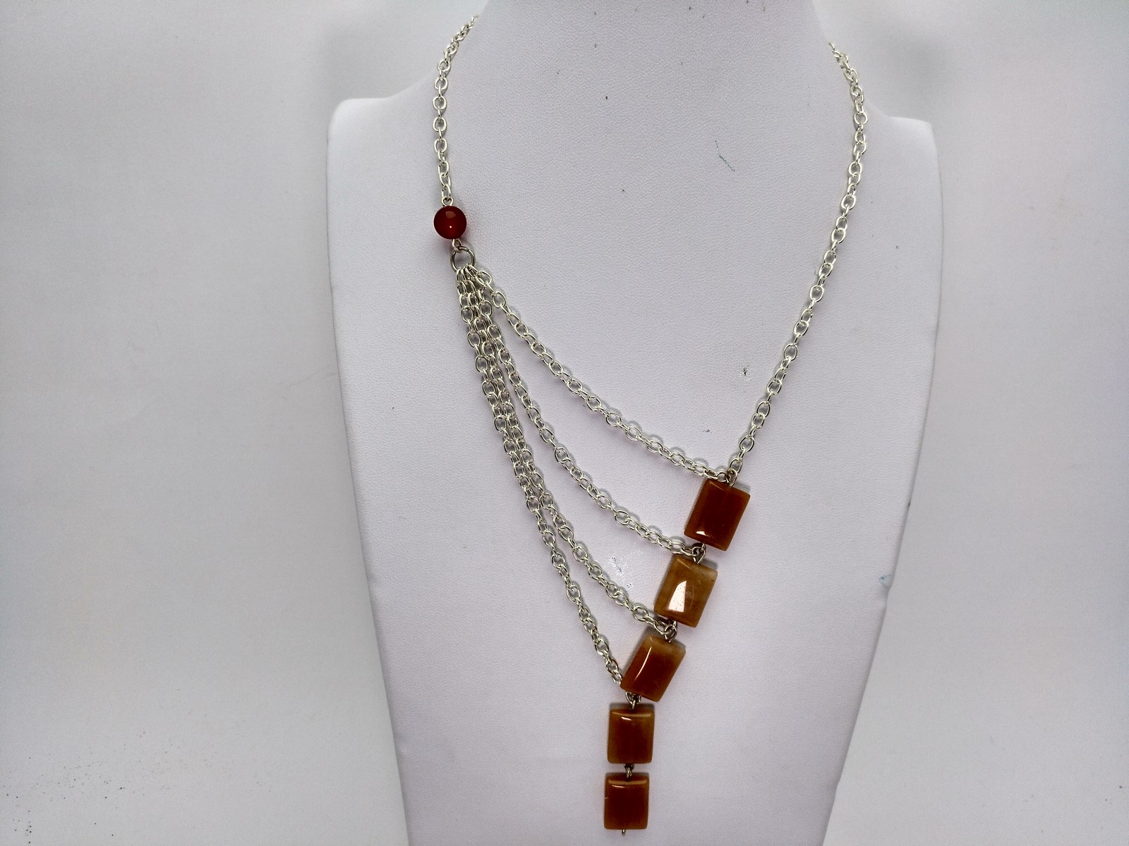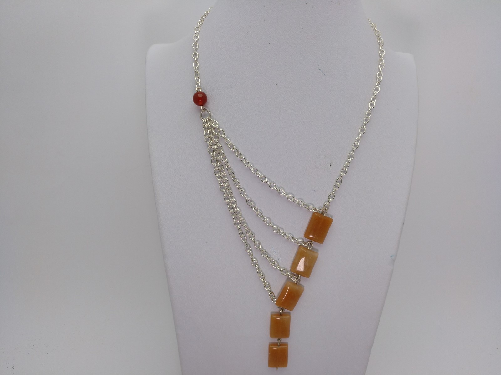 Su artesana nos demuestra como hacer un collar con rectángulos en mineral calcita, cadena y pendientes, con un largo de 58 cms.; elaborado con rectangulos de calcita que son simplemente, cabujones en forma rectangular del mineral de calcita, añadiendóle esferas en agata corneola, con cadena plateada, bastones, y pendientes en plata ley, terminado con cierre mosquetón plateado.