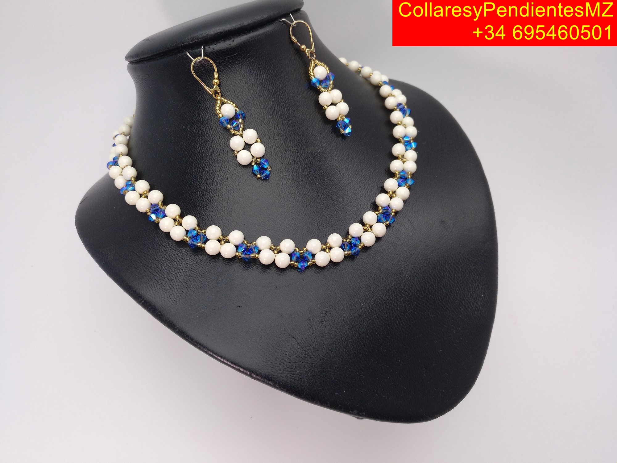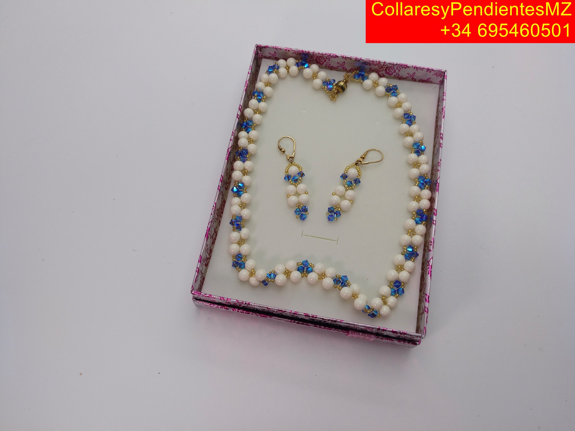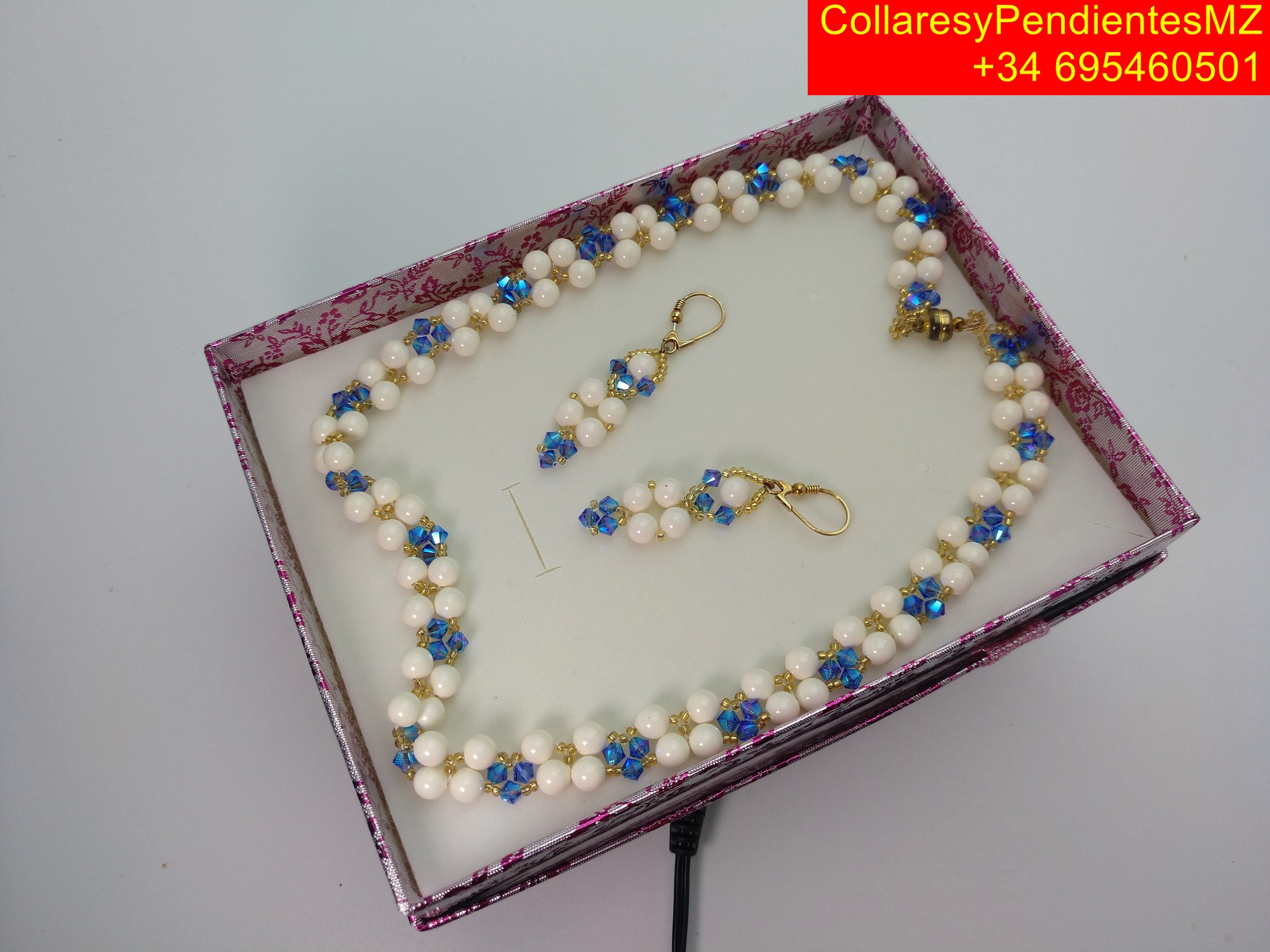 Collar con Pendientes, elaborado artesanalmente en Perlas perladas. con el agregado de tupis, rocalla, y cierre magnetico dorado, y el agregado de facetados de Swarovski, pendientes en plata dorada. collar largo 45 cms, tipo gargantilla, y pendientes de 5 cms. peso total 60 gramos. enviandose en caja de carton de joyeria con tapa de 16x12x3 cms, para su presentacion como regalo.