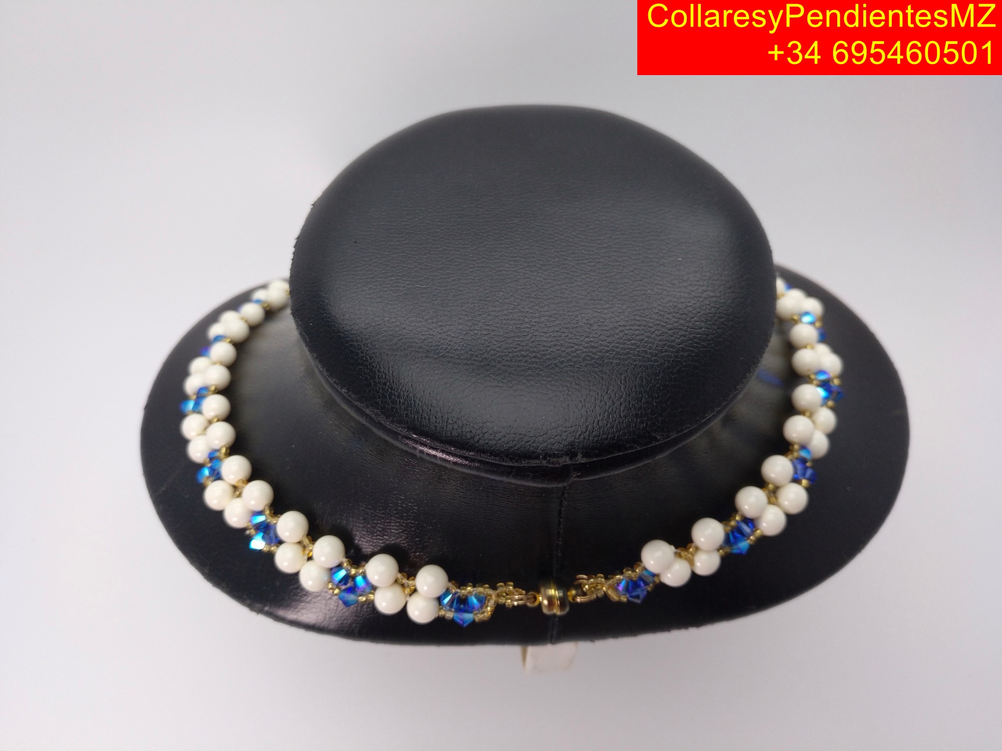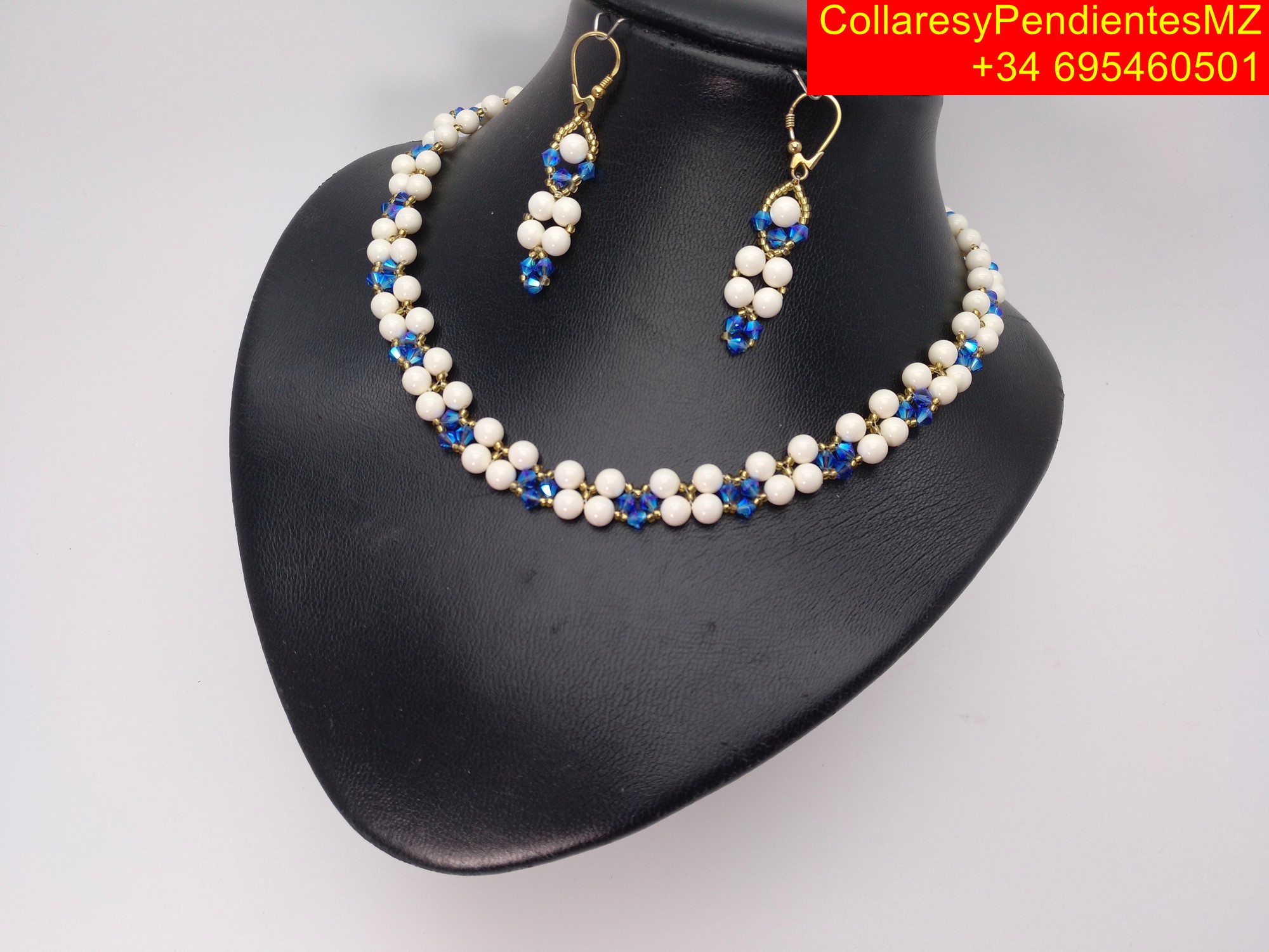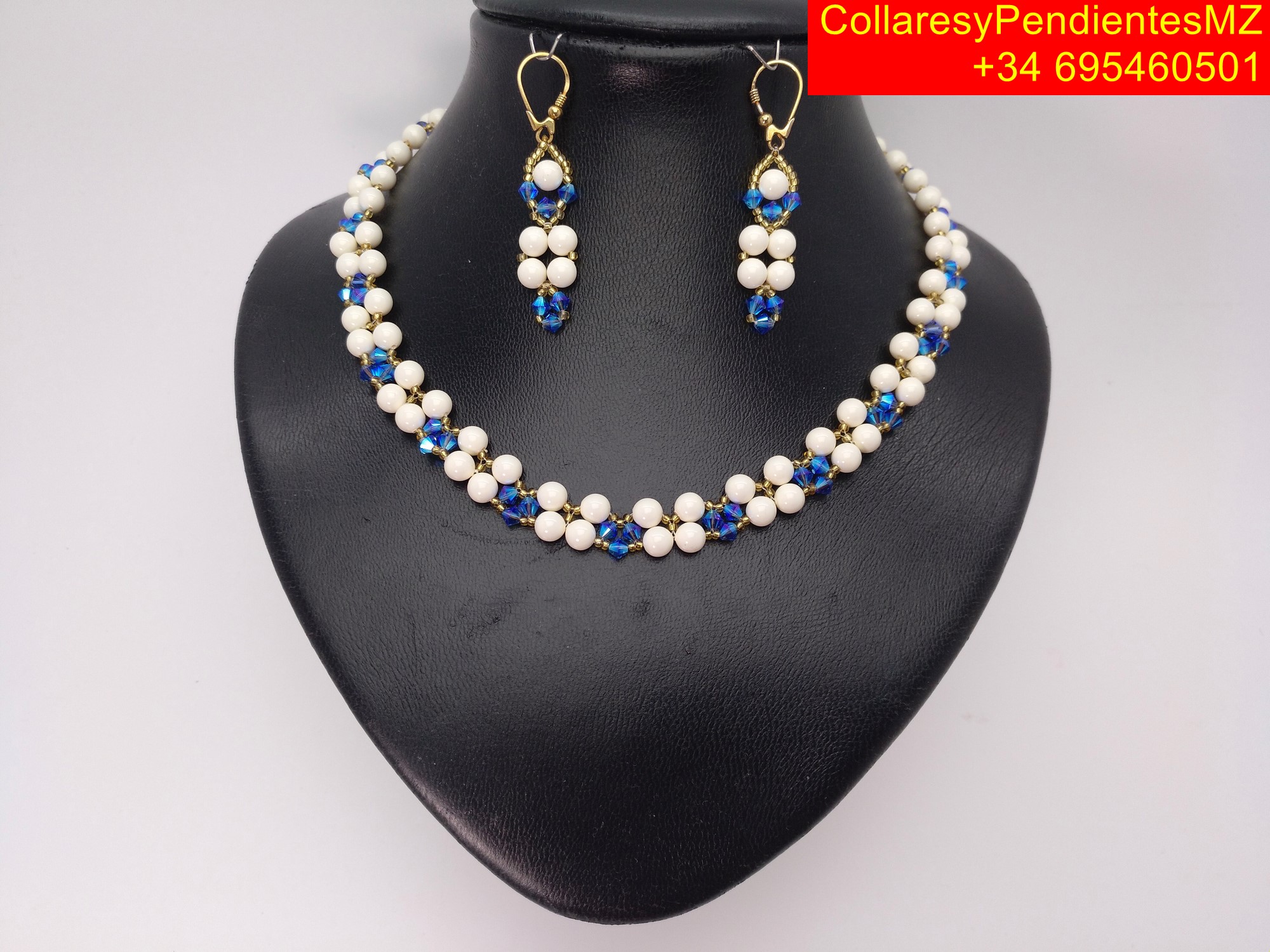 Collar con Pendientes, elaborado artesanalmente en Perlas perladas. con el agregado de tupis, rocalla, y cierre magnetico dorado, y el agregado de facetados de Swarovski, pendientes en plata dorada. collar largo 45 cms, tipo gargantilla, y pendientes de 5 cms. peso total 60 gramos. enviandose en caja de carton de joyeria con tapa de 16x12x3 cms, para su presentacion como regalo.