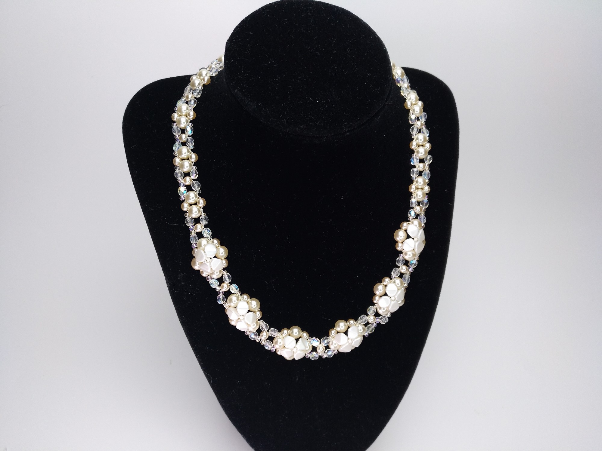 Bridal necklace, called choker or uniform, for women, 36 cm long, handcrafted with pearls of two sizes, pinch beads, faceted bohemian, with the addition of seed beads, Crystal thread, of good quality, finishing it with a magnetic closure, UNIQUE DESIGN handmade, with the best products in the market. Her work can be seen on the website mineralesenventa.com, on the YouTube channel Collares y pendientesmz.es, or on this page collares y pendientesmz.es, a place where its artisan exhibits all her ingenuity, with samples of her tools and products used. Pearls correspond as a birthstone to the month of JUNE, good corporate gift, or events such as weddings.