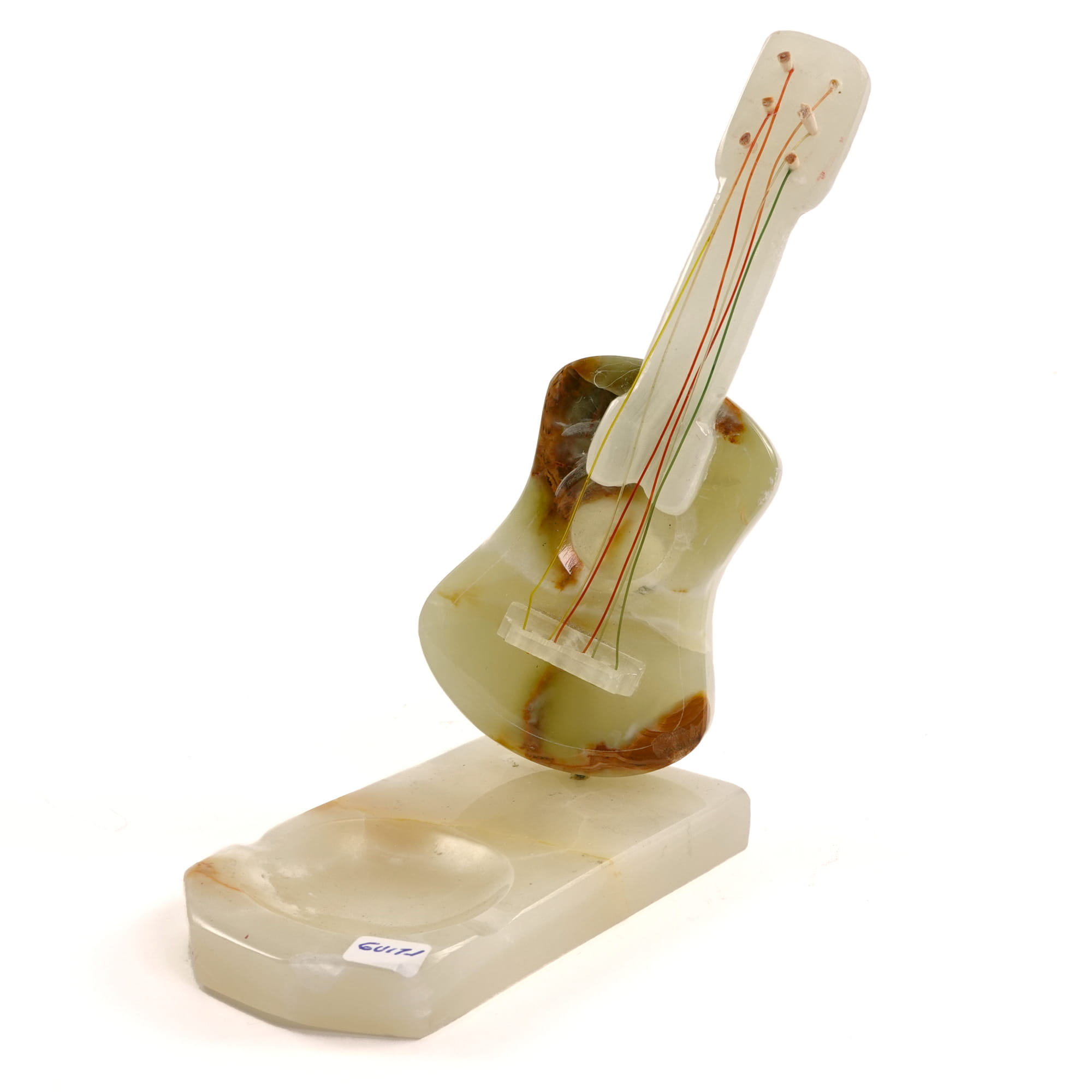 Guitarra con cenicero tallada en un trozo de mineral onix blanco, material procedente en bruto de la provincia de San Luis, Argentina, de las siguientes dimensiones: 12 x 8, con un peso de 200 gramos, terminado, con sus correspondientes cuerdas en hilo transparente blanco.
