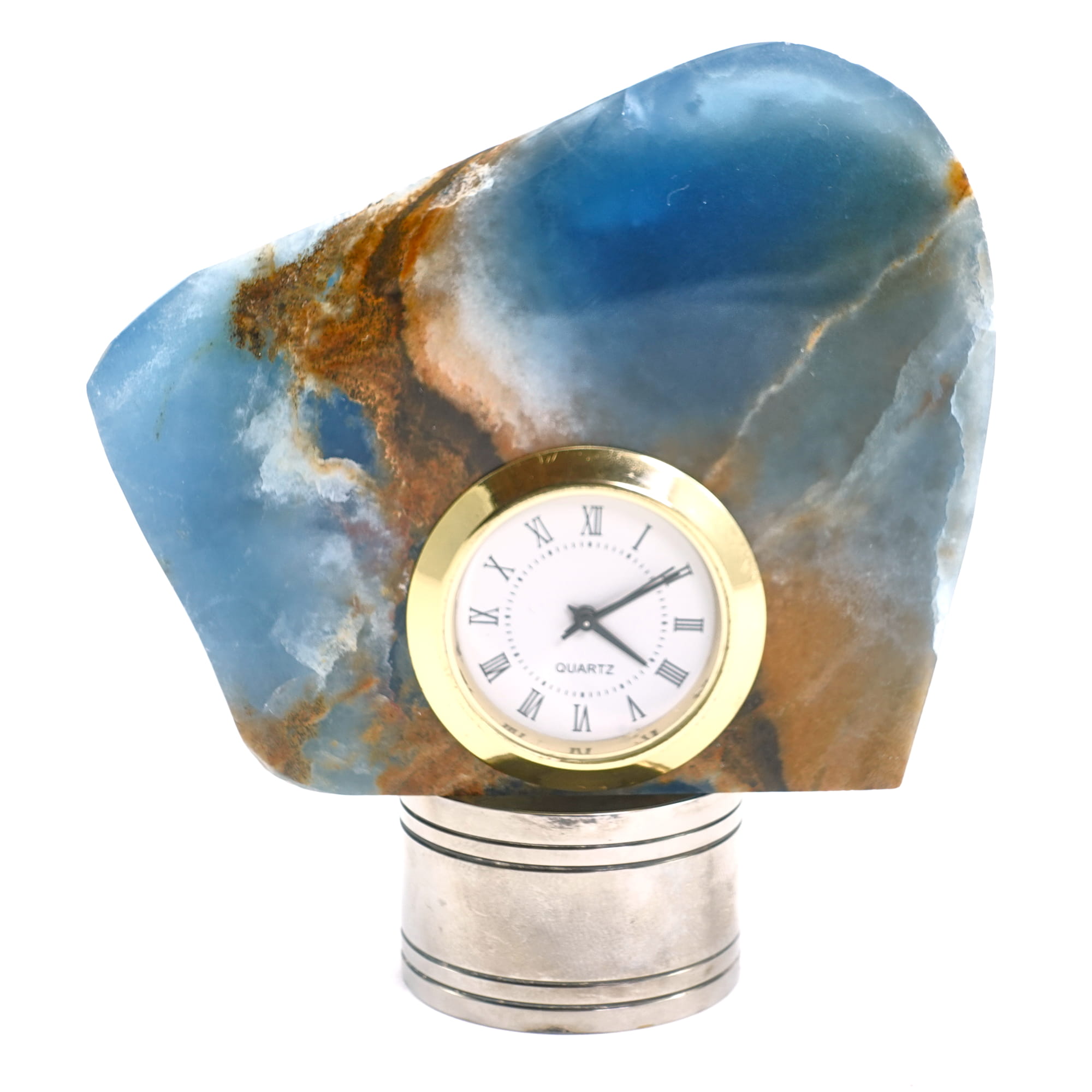 «ELEGANCE IN THE PRESENTATION OF THE HANDMADE CLOCK IN SKY ONYX, SUITABLE FOR YOUR CENTERPIECE»