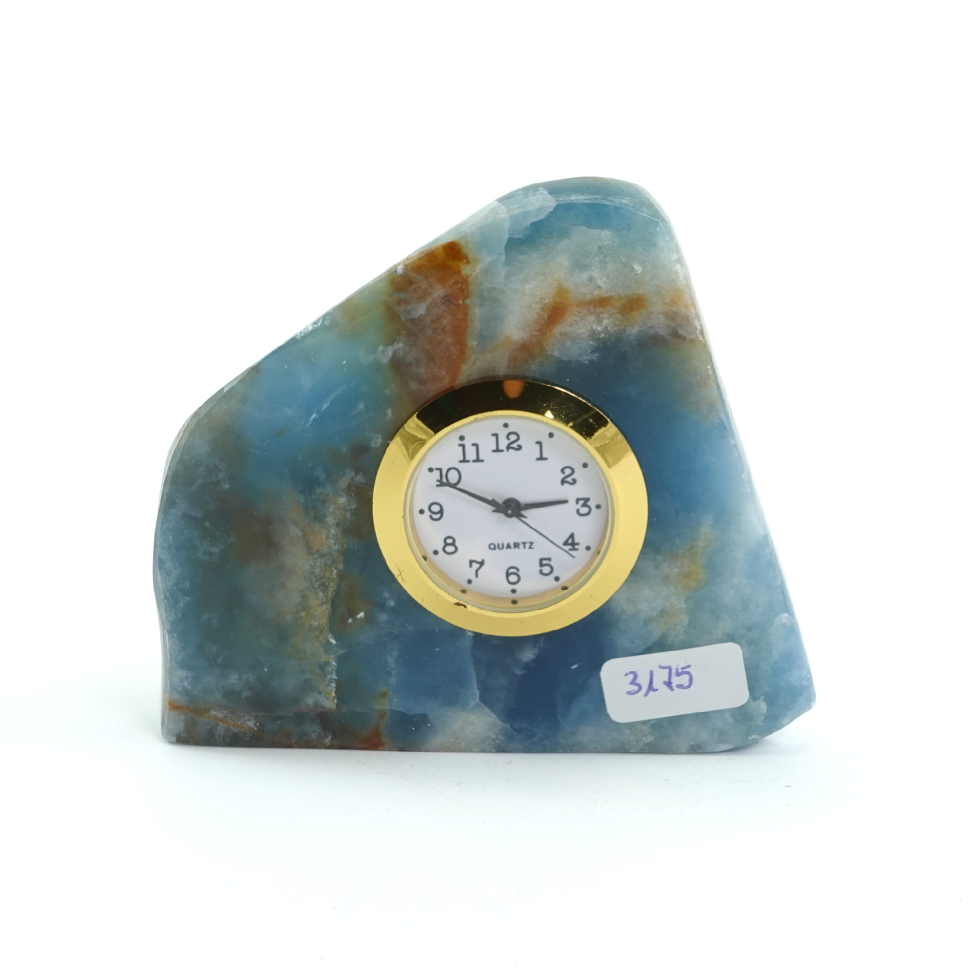 Reloj tallado en un trozo de mineral onix azul, con maquina redonda a pila incorporado, sobre base de aro en latón dorado, con un peso de 150 gramos, material procedente de Salta, Argentina.
