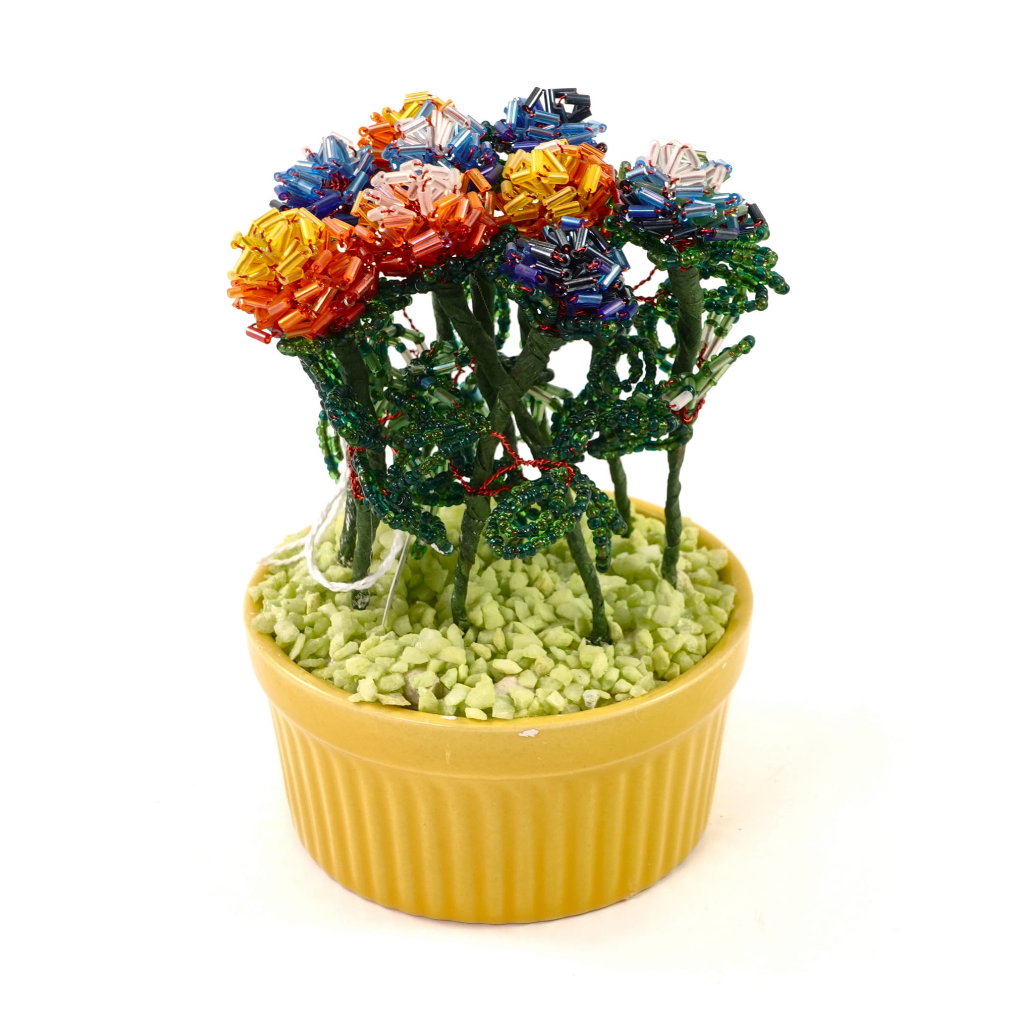 Conjunto de rositas de diversos colores hechas en abalorio artesanalmente, introducidas en maceta de ceramica color amarillo, ideal regalo como centro de mesa, ángulo de escritorio, resaltando sus colores propios de las rosas naturales, elegancia en su artesania, elaborada con alambre de cobre de buena calidad.